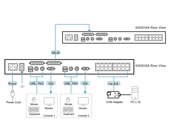 KH2516A là switch KVM cho phép quản trị viên IT truy cập và điều khiển nhiều máy tính từ hai console KVM chuẩn PS/2 hoặc USB (hai bus). Hai người vận hành có thể làm việc độc lập và đồng thời, mỗi người điều khiển tối đa 16 máy tính. Khi kết nối chuỗi (daisy-chain) tối đa 15 switch bổ sung, hệ thống có thể mở rộng quản lý lên đến 256 máy tính từ hai console KVM ban đầu.